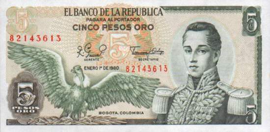 "Colombia" 5 Pesos Oro 1980 (P406f) - unz.