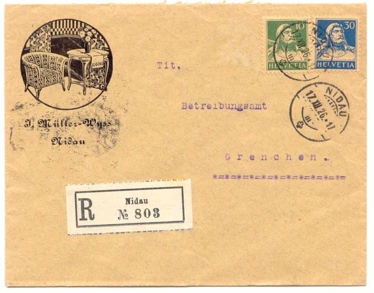 Eingeschriebten Brief von Nidau (J.Müller - Wyss) nach Grenchen mit 2 "Tell" Marken (10 & 30 Rp) gestempelt in Nidau 17.12.1926