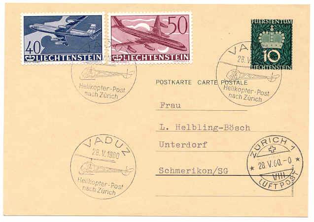 Liechtenstein: Helikopter Post nach Zürich, Vaduz - Schmerikon SG 1960, mit Briefmarken 10, 40 und 50 Rp gestempelt 1960