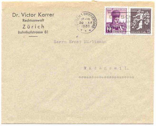 "Dr. Victor Karrer" Rechtsanwalt Bahnhofstrasse 18 Zürich, von Zürich nach Wädenswil 30.12.1939, mit Briefmarken 10+5 (Pro Juventute) und 10 (Esposizione Nazionale) Rp gestempelt 1952